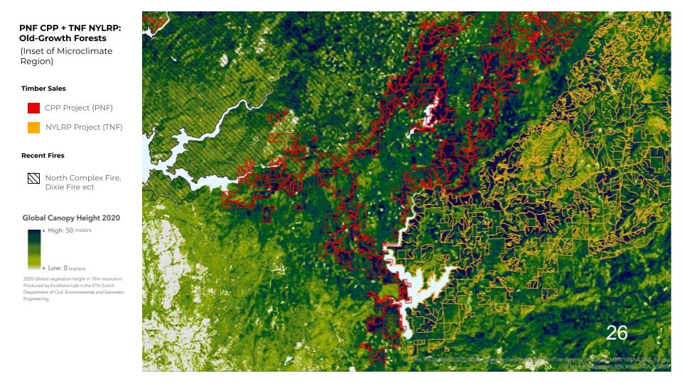 Pay special attention to slide 26 (above), this shows an overlap between Mature and Old Growth forest conditions (MOG, the darker green) and where logging is planned (red and yellow outlines). There is a very close overlap between canopy height, indicating MOG areas, and planned industrial removal of 77% of the forest canopy.