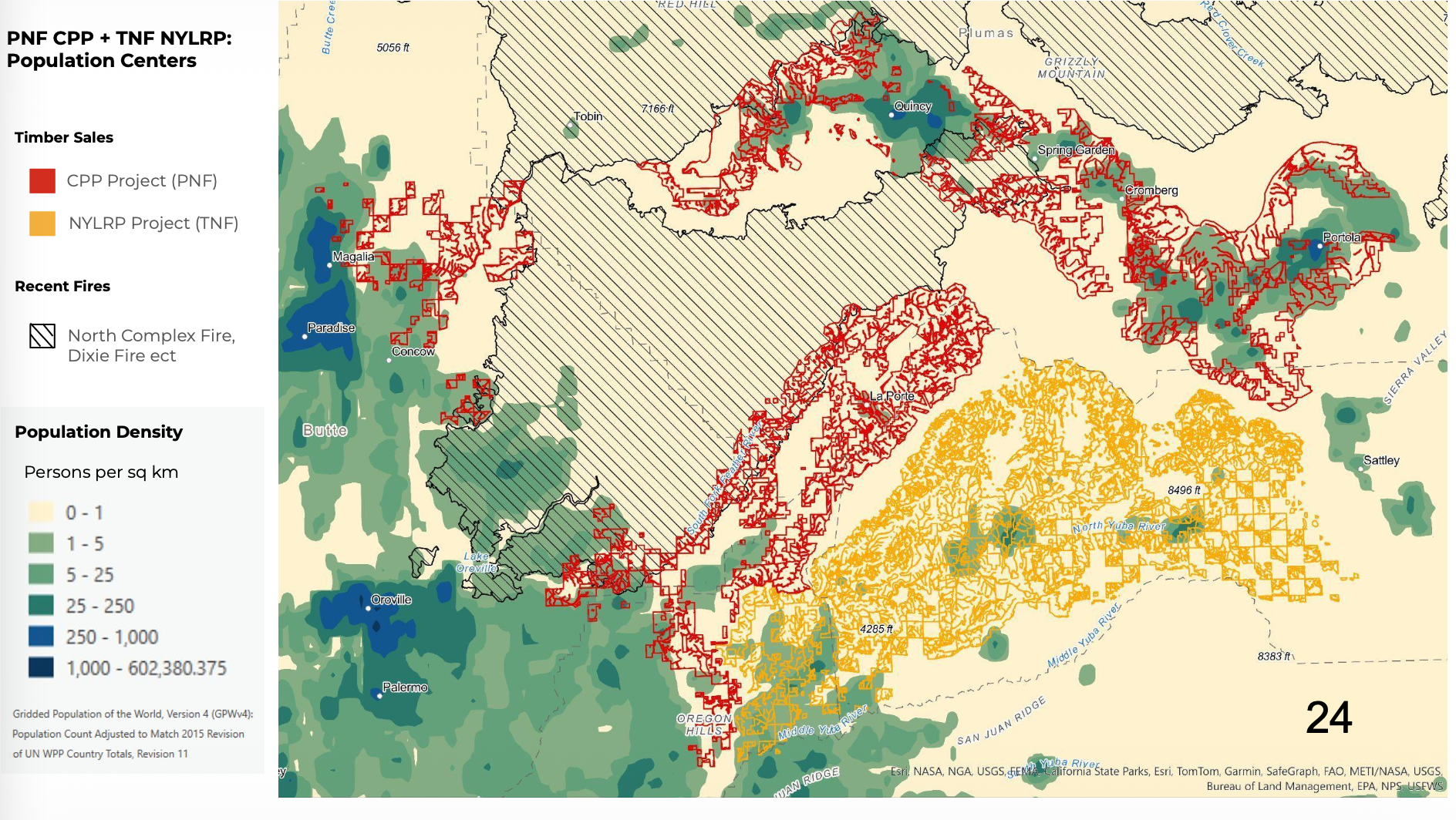 The priority “emergency” logging areas around La Porte (the southern area marked in red) and containing the largest trees, has been fast-tracked for heavy logging, and is largely nowhere near population centers (marked in green and blue), apparently having little to do with “community protection” and everything to do with using fears of a climate/ wildfire crisis to justify even more aggressive logging.