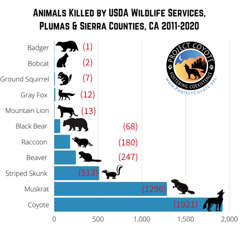 Even without the presence of wolves, the cattle industry is responsible for significant numbers of wild animals being killed at local taxpayer expense. Between 2011 and 2020, more than 4000 animals were killed by federal forces in Plumas and Sierra Counties. Properly protecting herds is the solution to this killing spree, but ranchers don’t want to spend the extra time or money it takes to do it right.