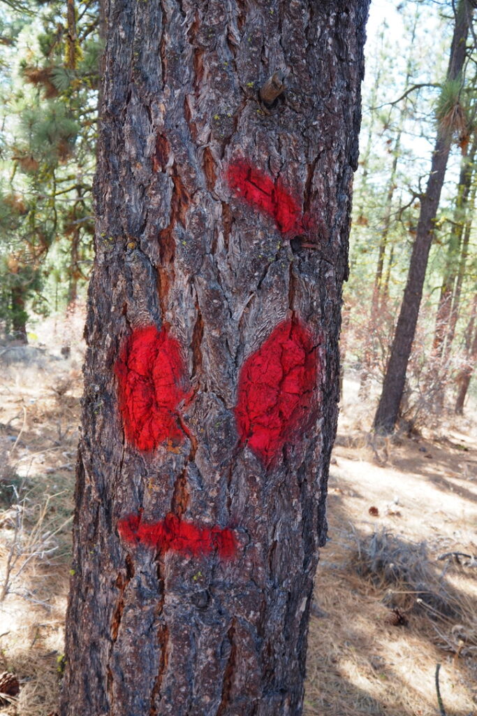 Trees marked to designate private land boundaries in preparation for landscape level logging.