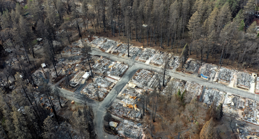 Homes burned in Paradise. Note living trees surrounding. If these homes had been hardened, using money that USFS paid to thin surrounding forest (that the fire raced through into town), they would still be there, and many fewer souls would have perished.